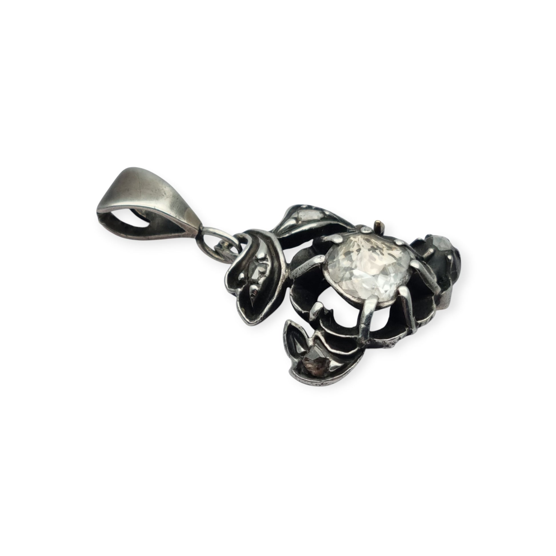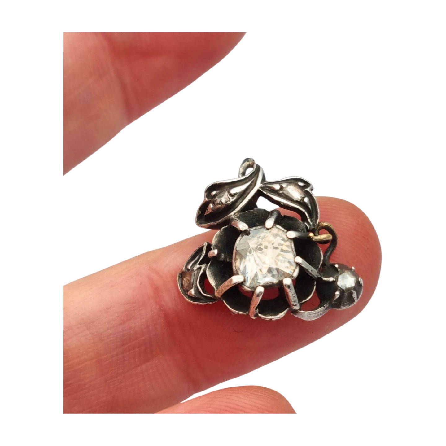 Designed with a central floral motif embracing an old-cut diamond, this pendant showcases fine silverwork with partial gold accents, visible on the reverse. The composition evokes the elegance of the Victorian era, characterized by its botanical symbolism. The main stone measures 6.4 mm in width and is notable for its brilliance and hand-cut finish. Ideal for collectors or as a vintage piece of jewelry to wear.