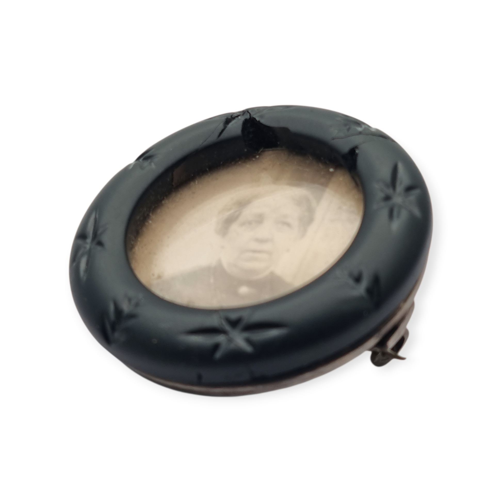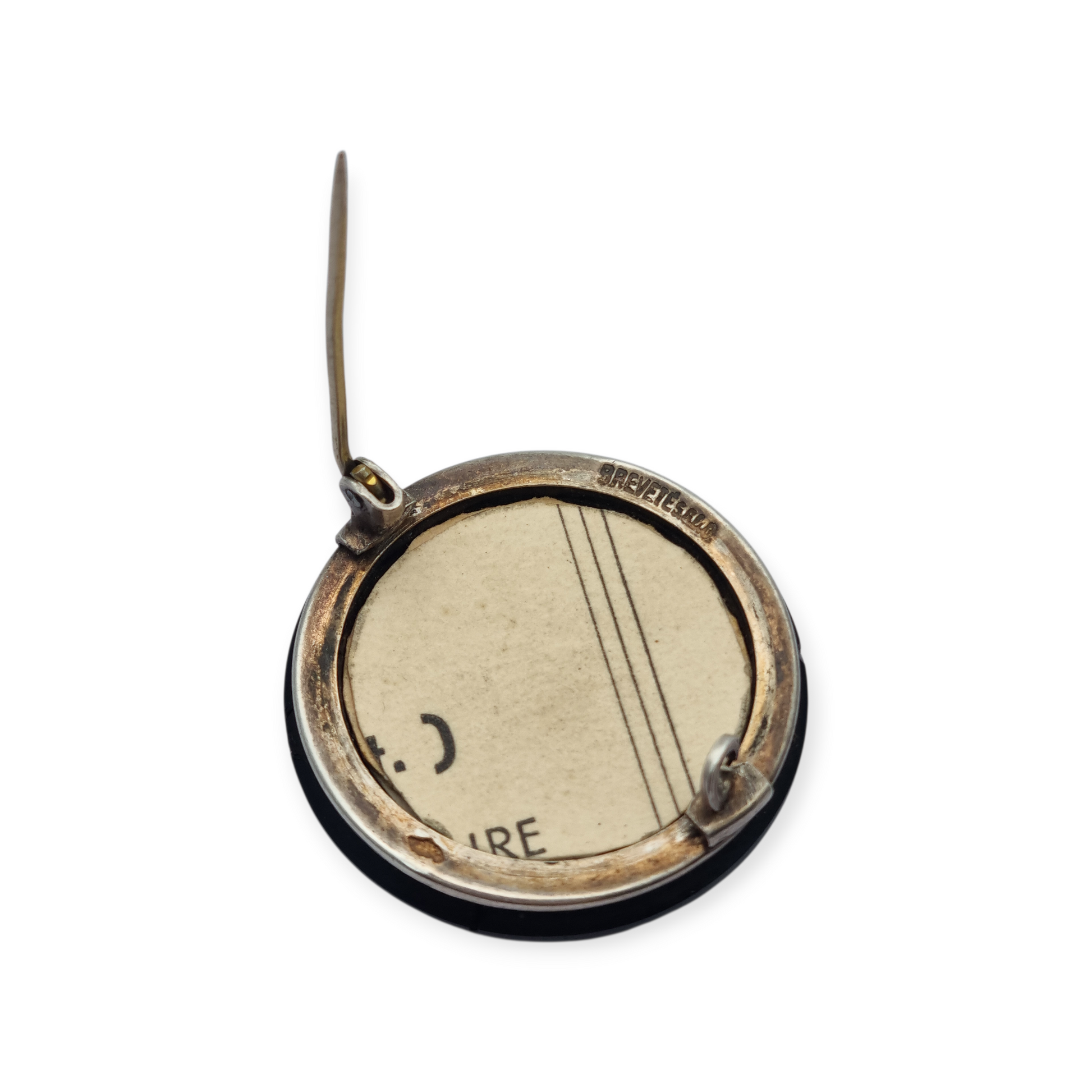 Circular piece with a front frame in black vulcanite carved with small stars in relief. The back is silver and retains the original clasp. The inner ring bears the hallmark “Breveté SGDG” , a reference to the French patent system in force since 1844 (“Breveté Sans Garantie Du Gouvernement”), indicating French manufacture.