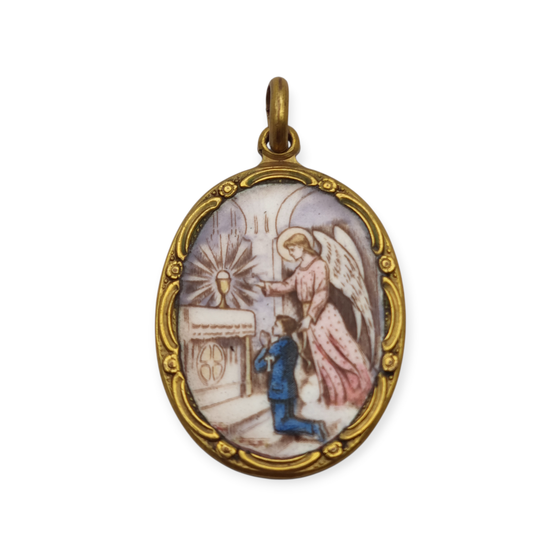 Art Nouveau medal in metal and enamel, circa 1910-20, with an angel and child in adoration before the Eucharist. Oval shape with decorated frame and top loop.