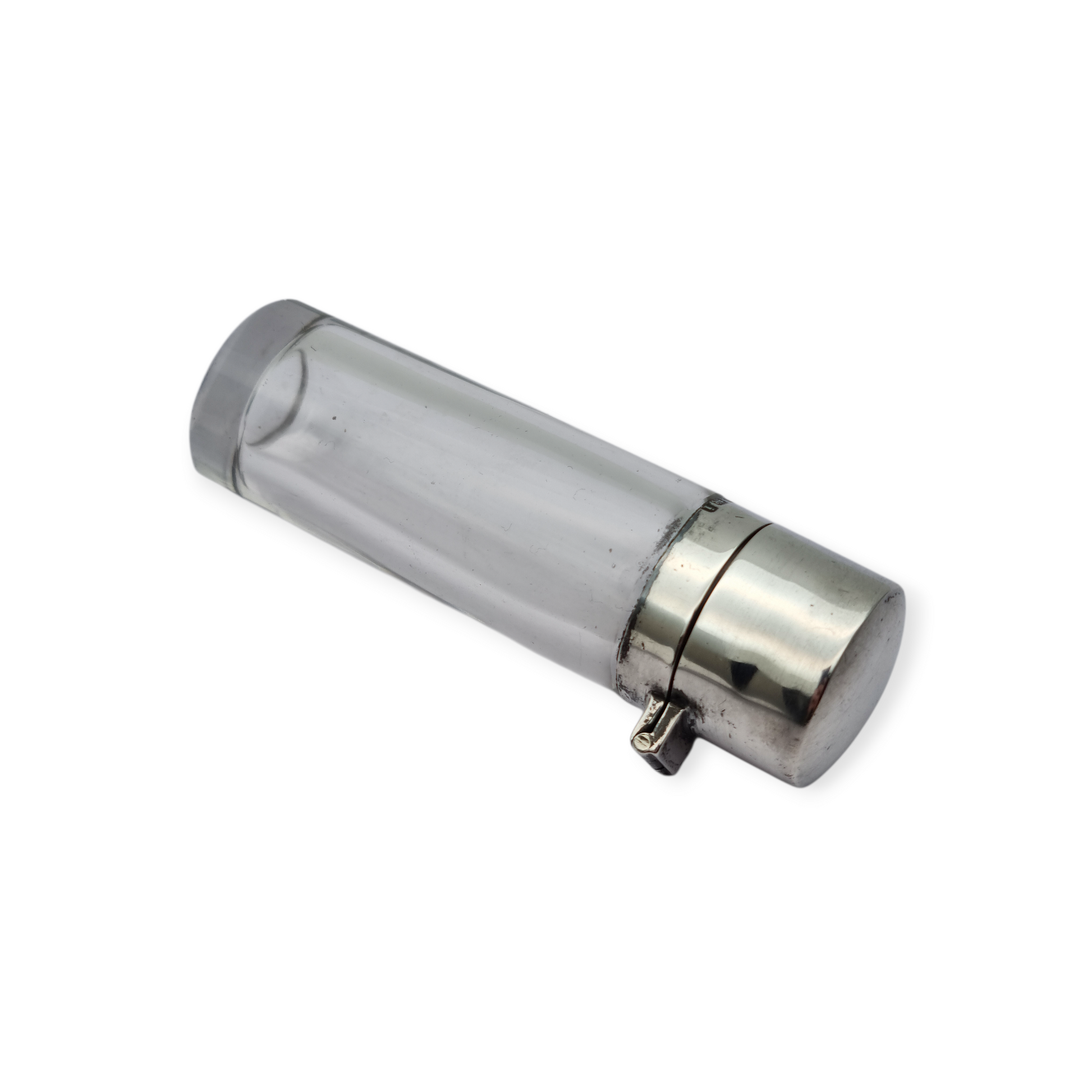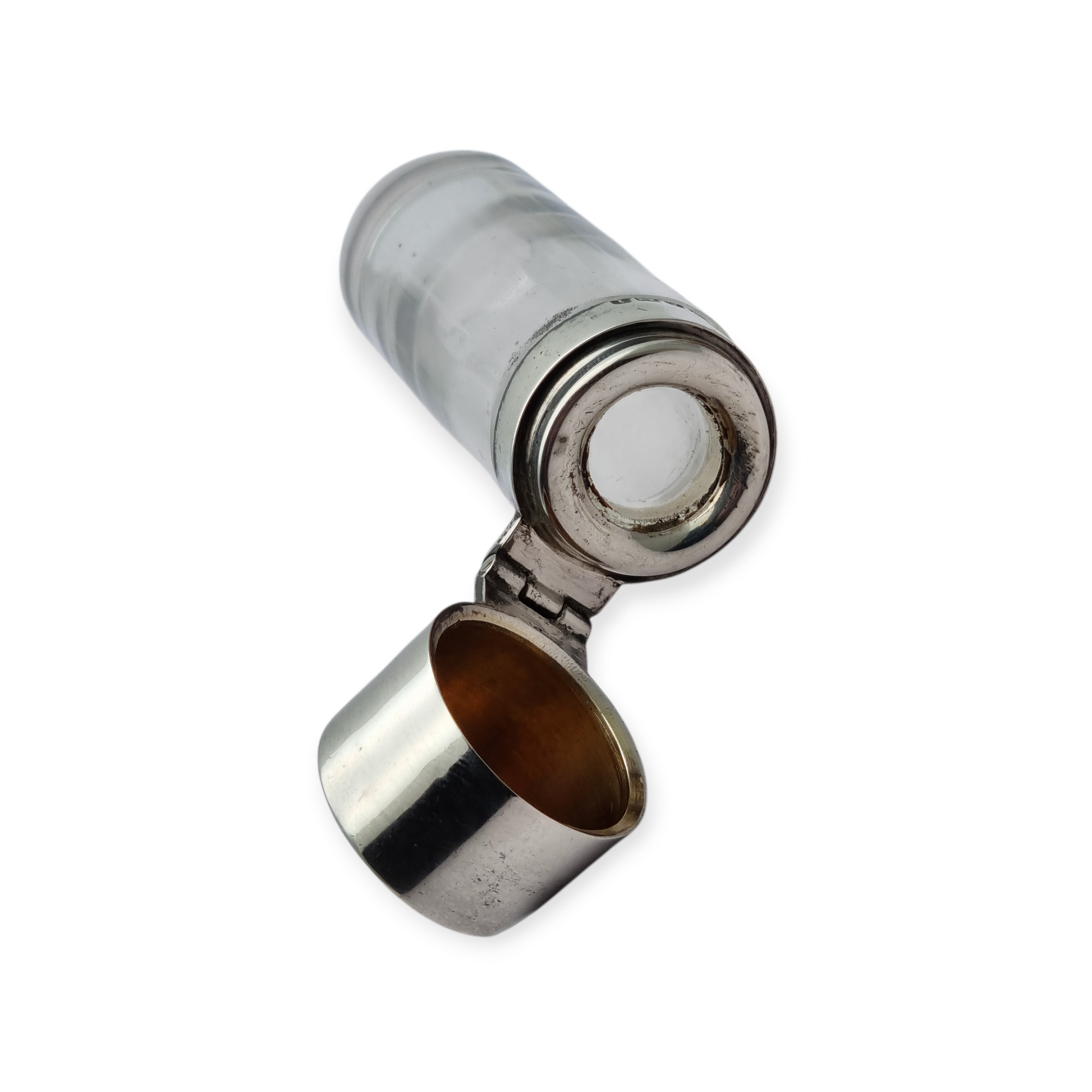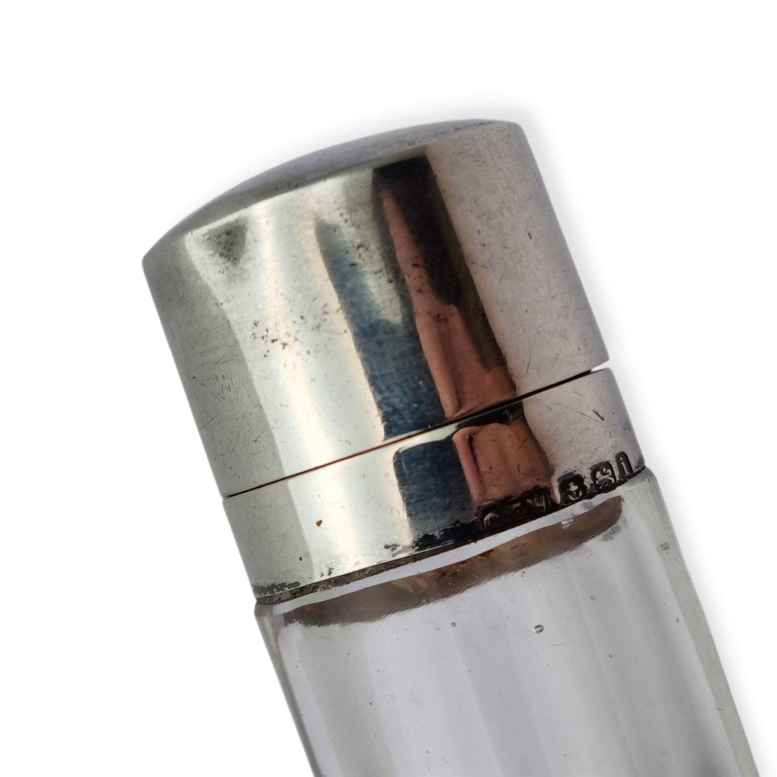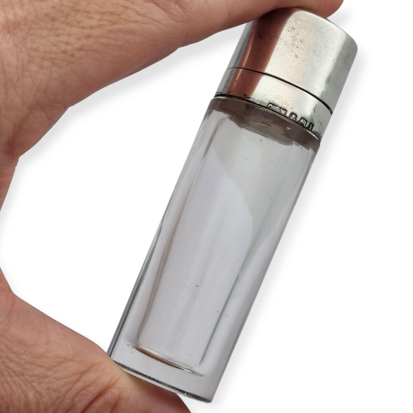 Victorian silver and glass perfume bottle with Birmingham hallmarks 1908. Cylindrical design with silver hinged lid and glass body, retains inner cork stopper.