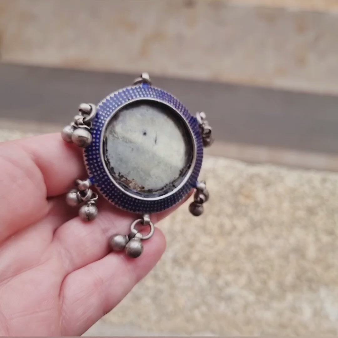 Large round antique ethnic mirror ring with decorative bells in worked silver and decorated with blue enamels, made in a rough and artisanal way. It is an original ring from Afghanistan that has been worn, it is not a new piece, please see the photos.