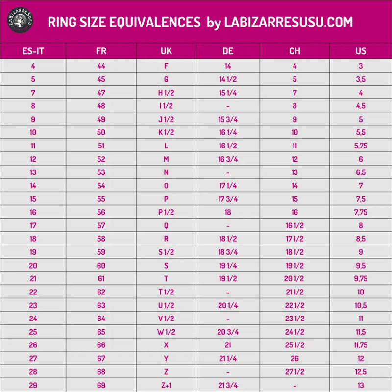 - Medidas: Talla 20 España (diámetro interior 19,6 mm), consultar la tabla de equivalencias por talla y pais.