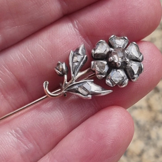 Broche floral victoriano de finales del siglo XIX (1880-1890), elaborado en oro y plata con diamantes antiguos engastados en forma de flor abierta con hojas en relieve, y un alfiler largo de oro con detalles artesanales. Esta pieza, característica del estilo botánico victoriano, es una joya histórica para coleccionistas y amantes de la joyería antigua. Es perfecto como alfiler de solapa o sombrero, ya que está elaborado con metales preciosos y diamantes auténticos.