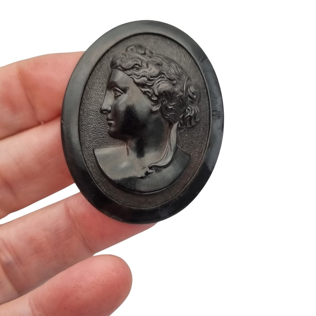 Broche Victoriano de luto original de finales del siglo XIX realizado en vulcanita, con camafeo en relieve representando un busto femenino de inspiración clásica. Pieza simbólica de la joyería de luto victoriana, con cierre largo de alfiler característico.