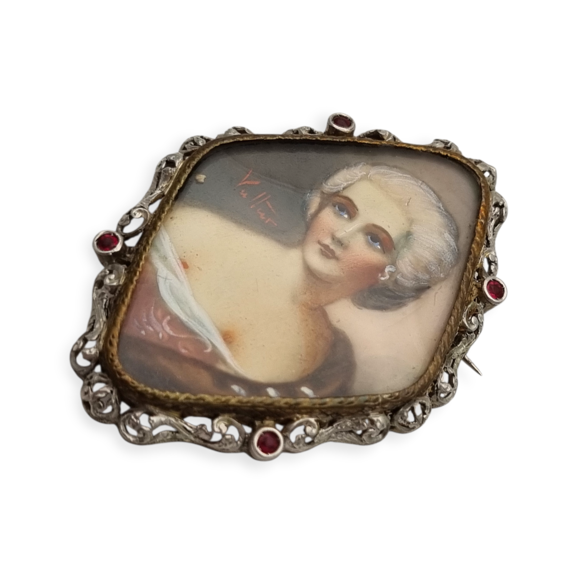 Broche victoriano con retrato femenino en miniatura pintada a mano firmado Vultur, con marco calado y cristales rojos. Circa 1880.
