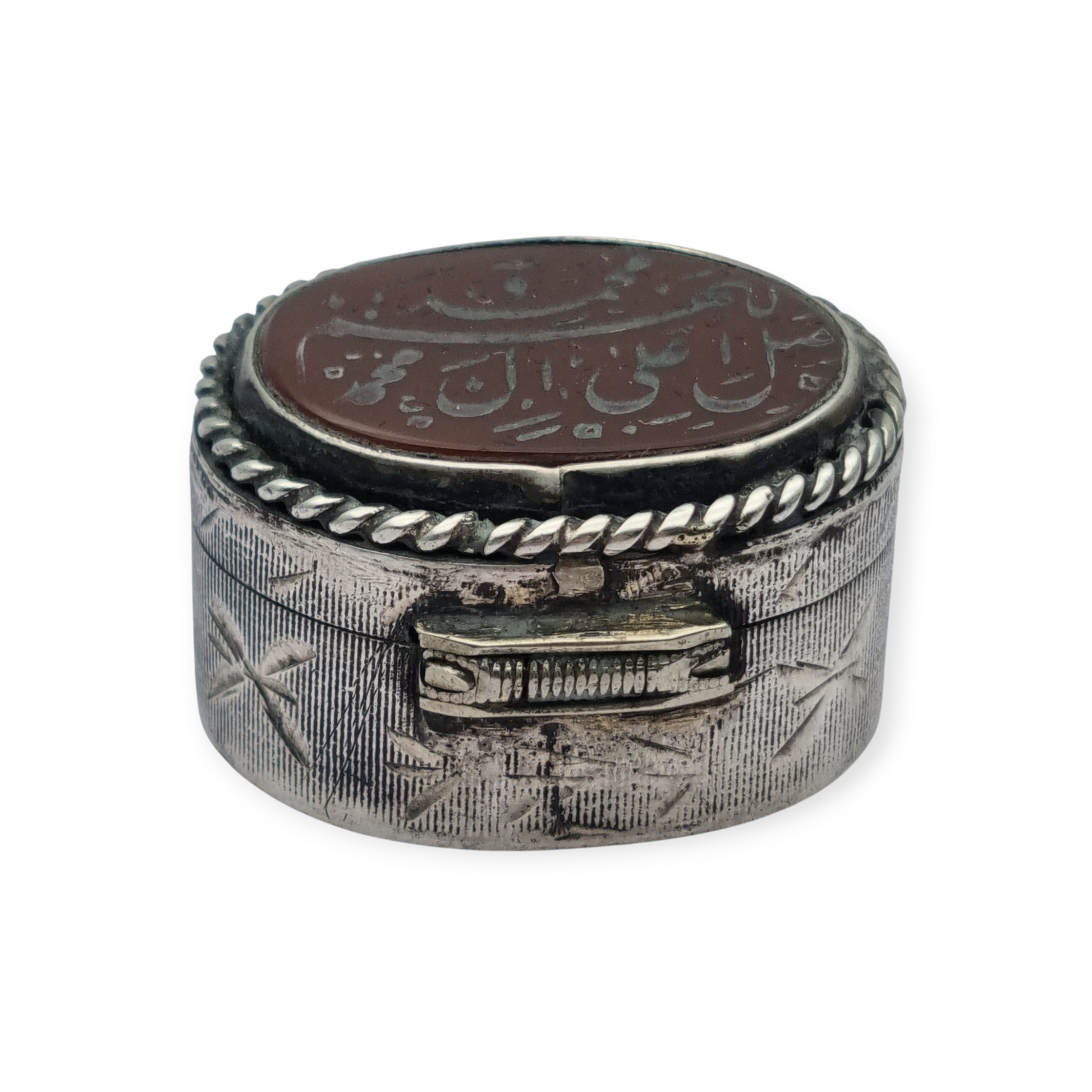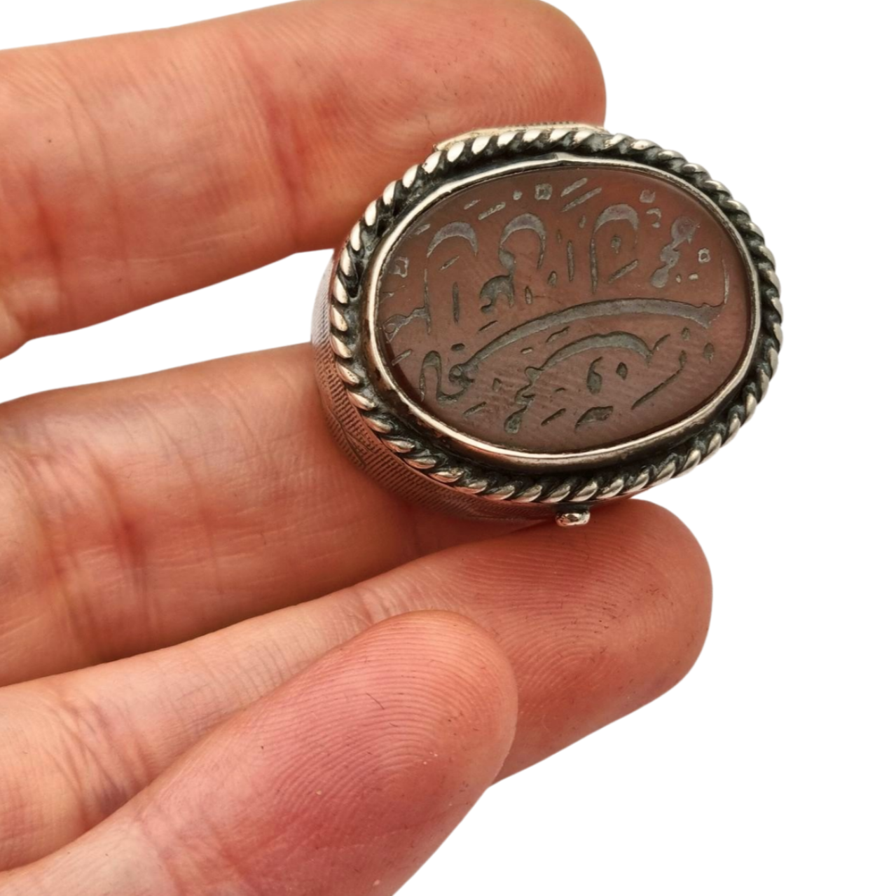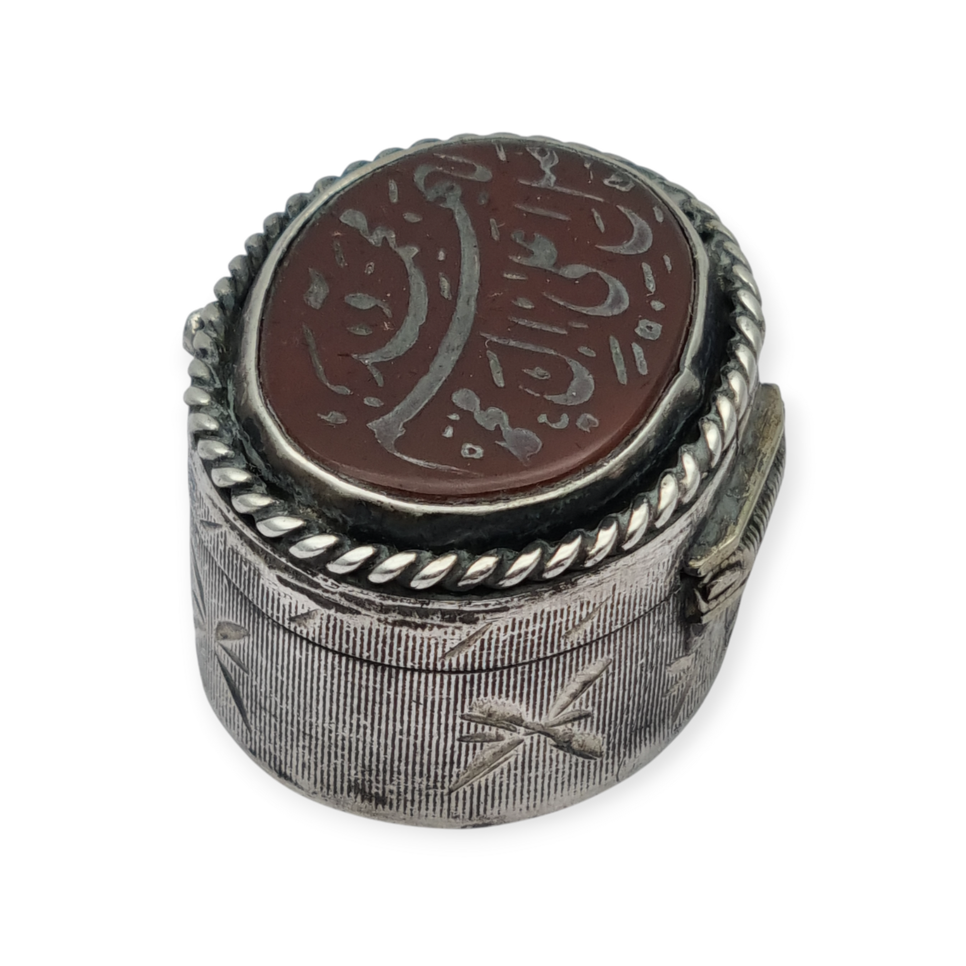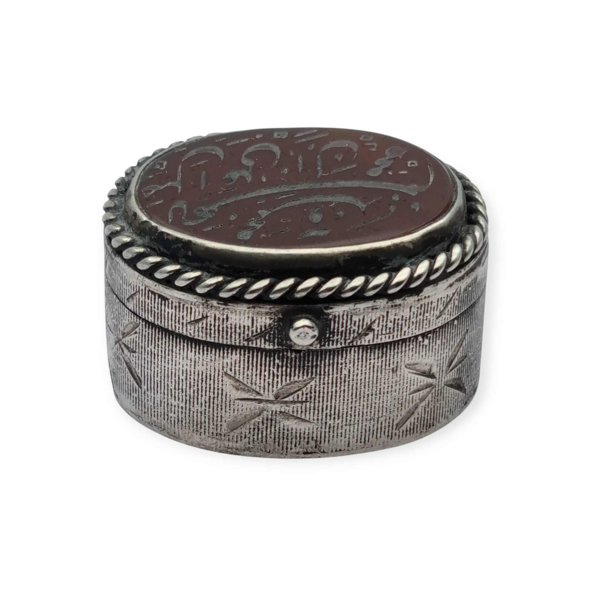 Caja antigua de plata 925 con tapa de cornalina grabada y caligrafía oriental
