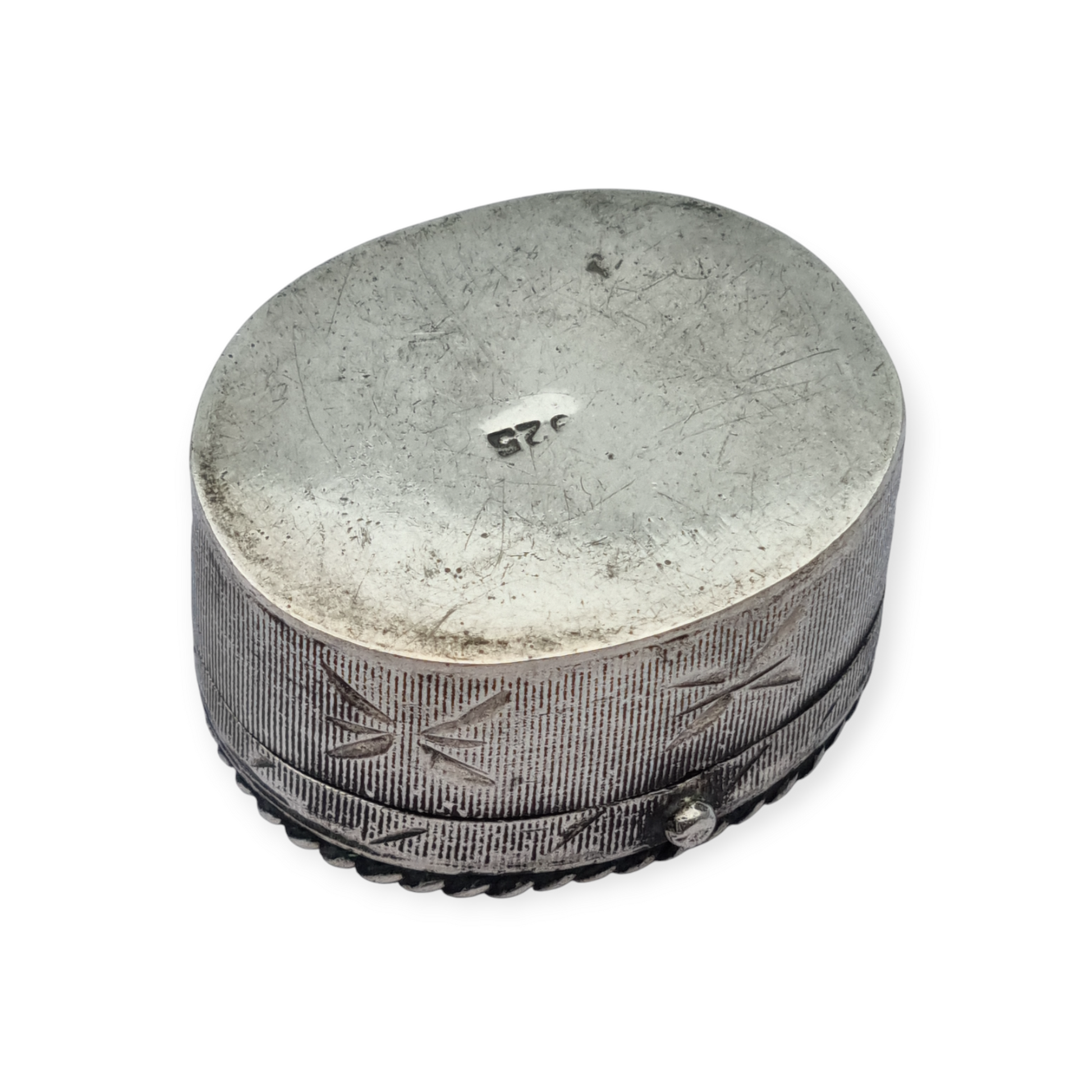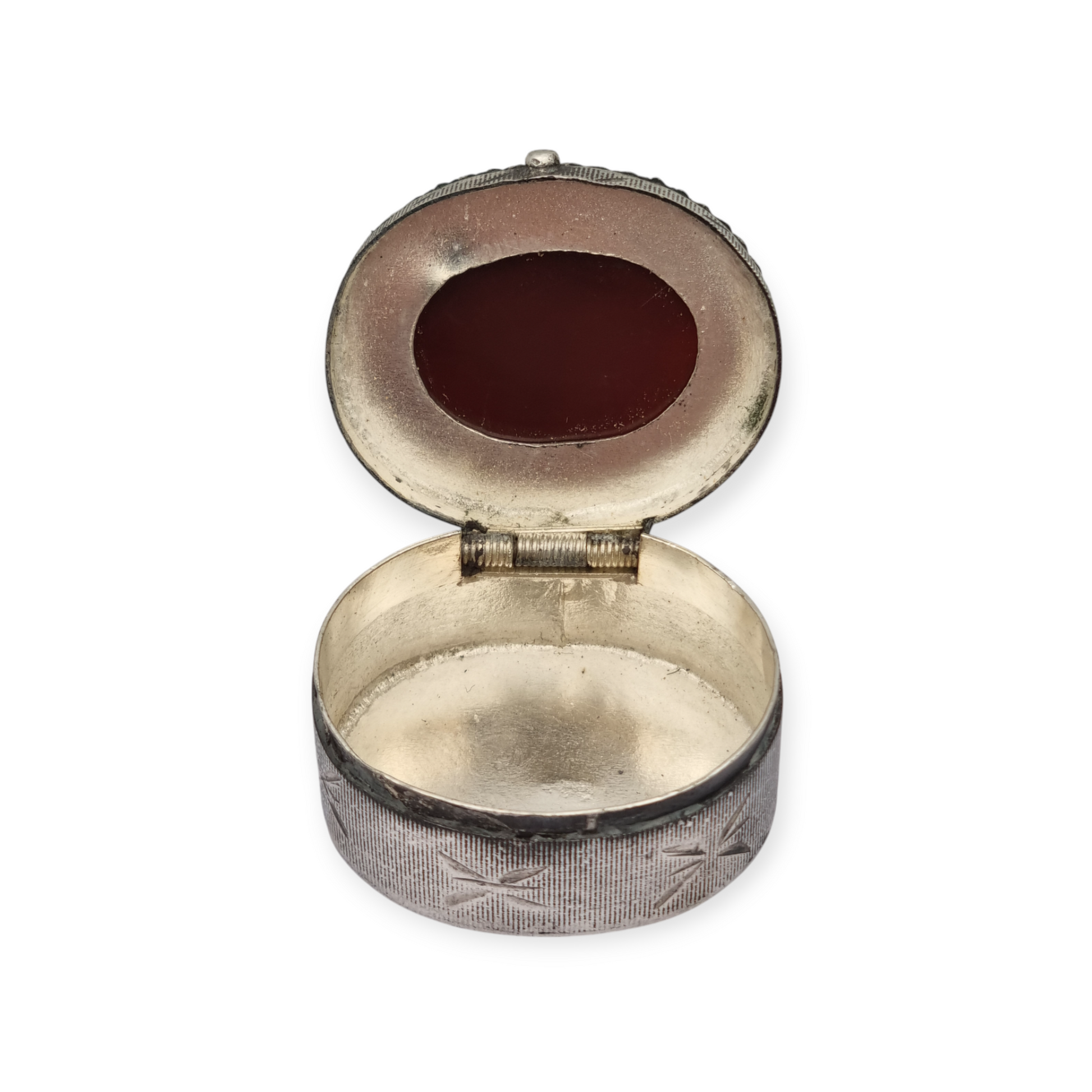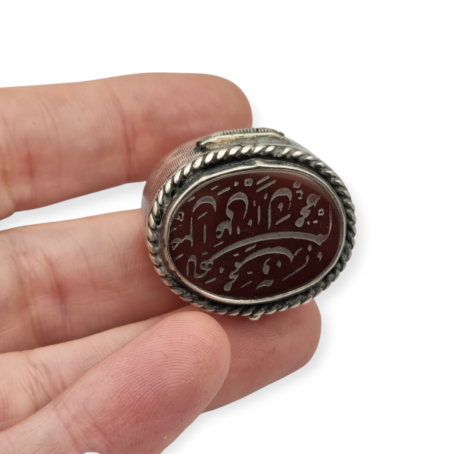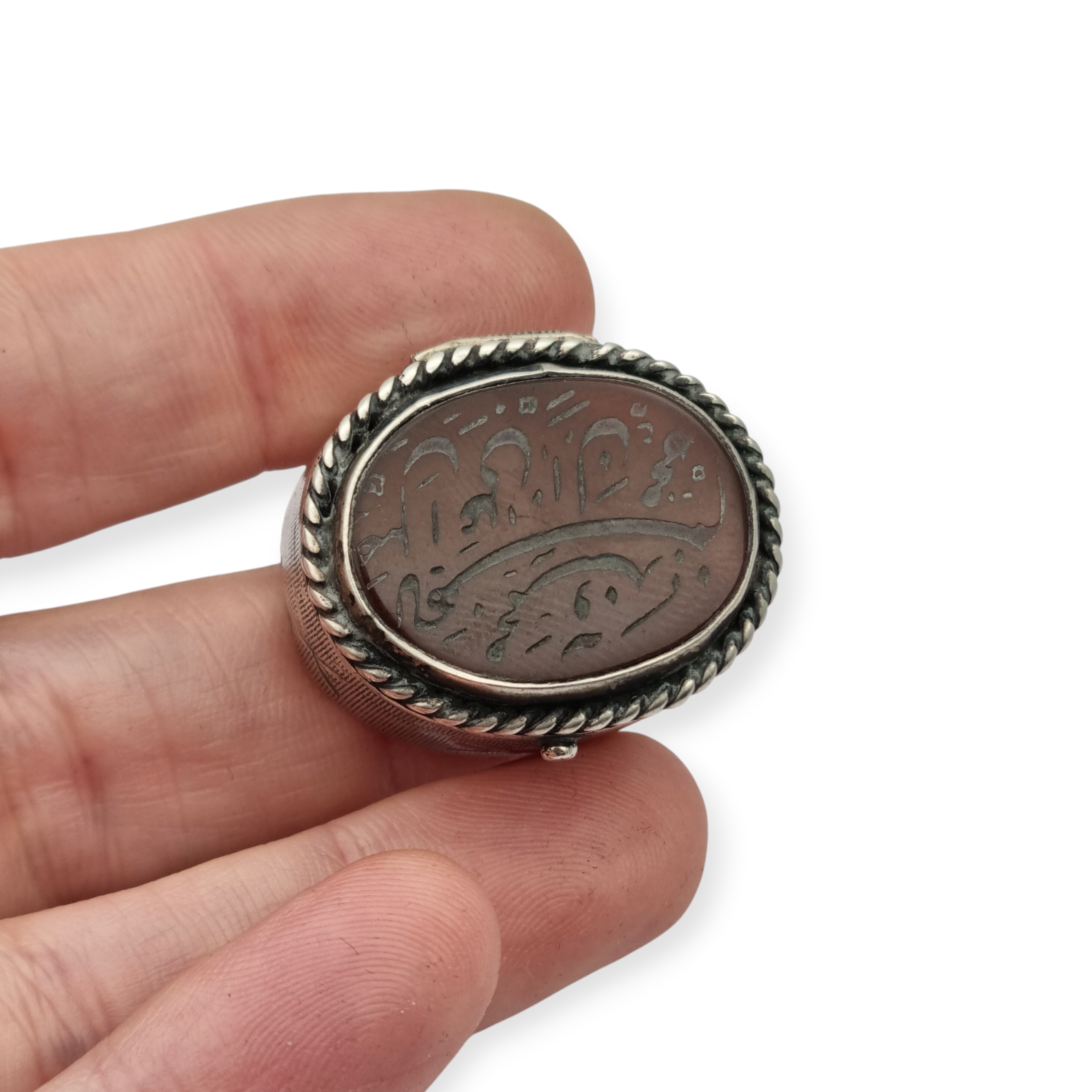 Caja antigua de plata 925 con tapa de cornalina grabada y caligrafía oriental