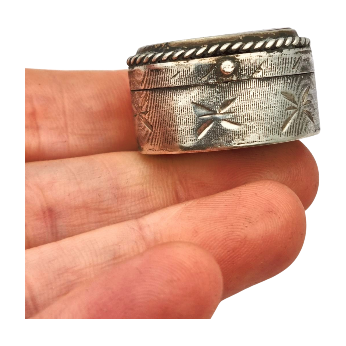 Pequeña caja antigua en plata con tapa de cornalina grabada con caligrafía oriental. Decoración lateral tallada a mano. Ideal para coleccionistas.