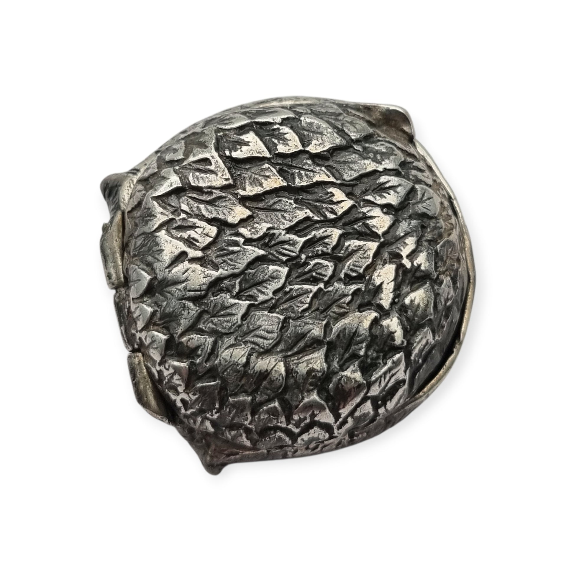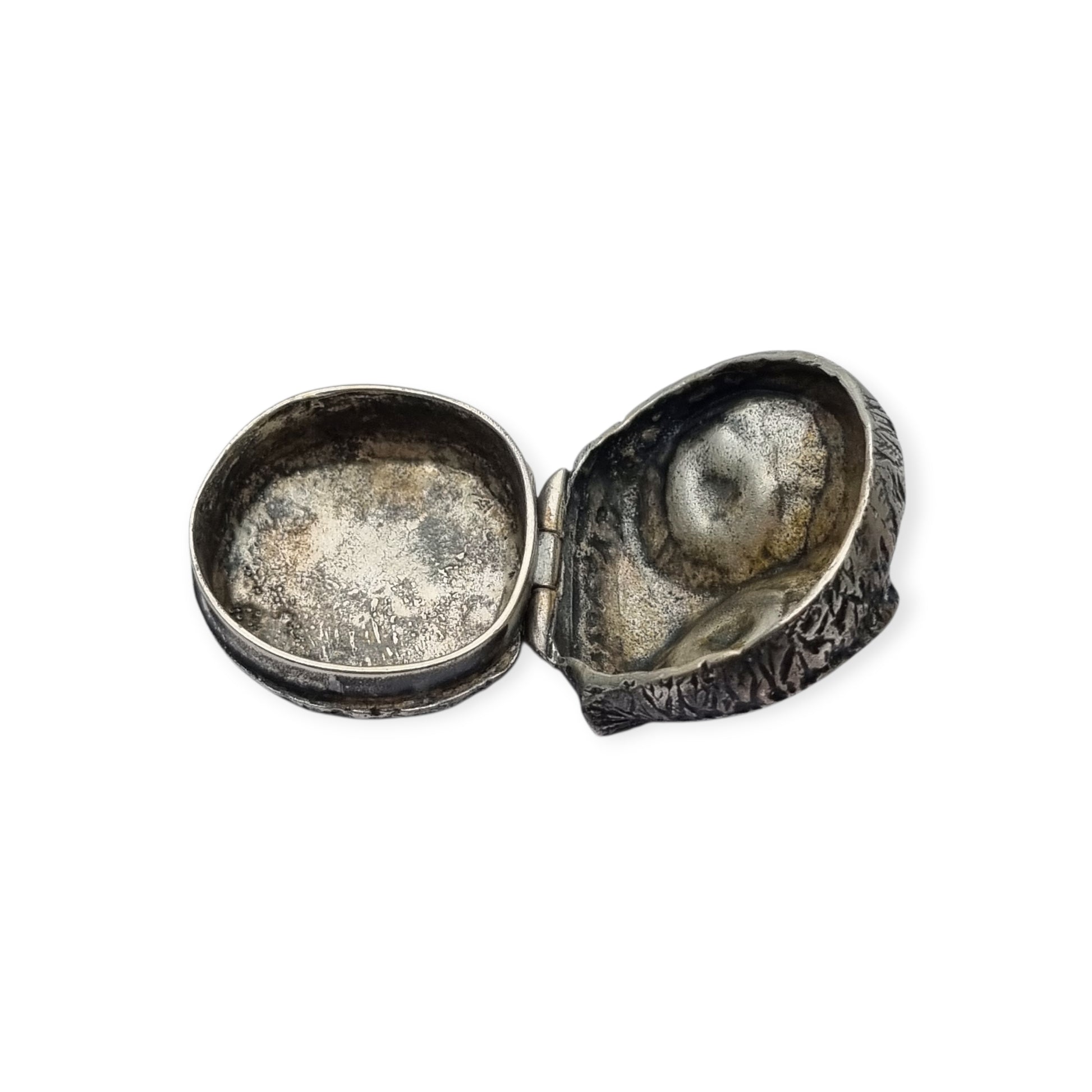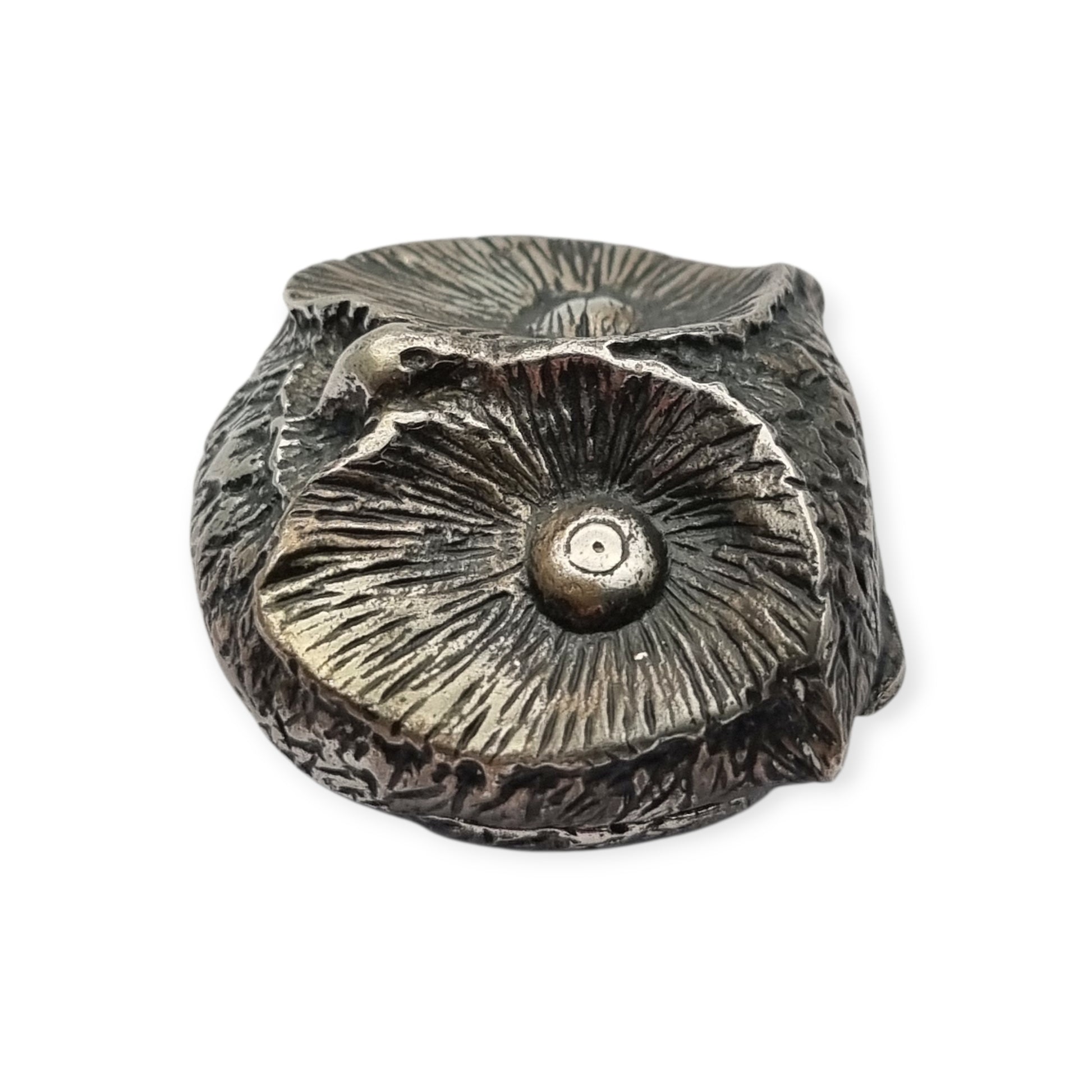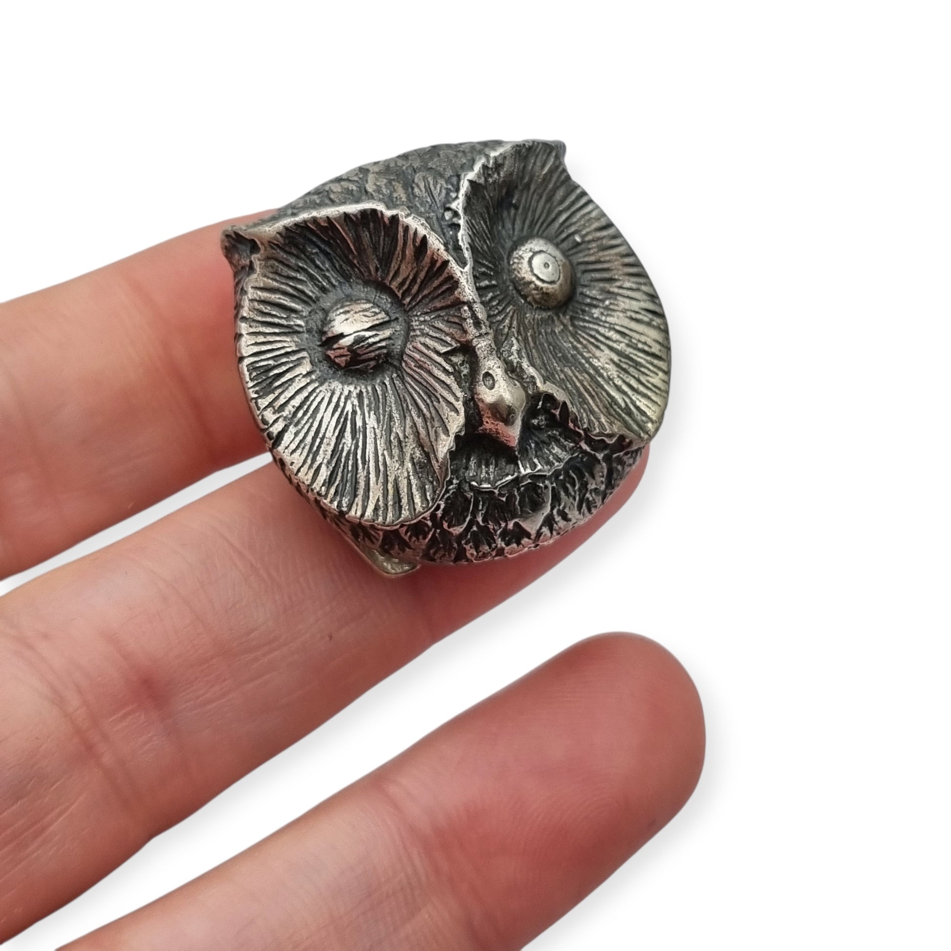 Singular caja italiana en plata 800 maciza con forma de cabeza de búho, con un diseño expresivo y estilizado propio del gusto animalista de los años 70. La pieza muestra al búho con un ojo abierto y otro cerrado, como en un guiño lleno de carácter, humor y simbolismo.