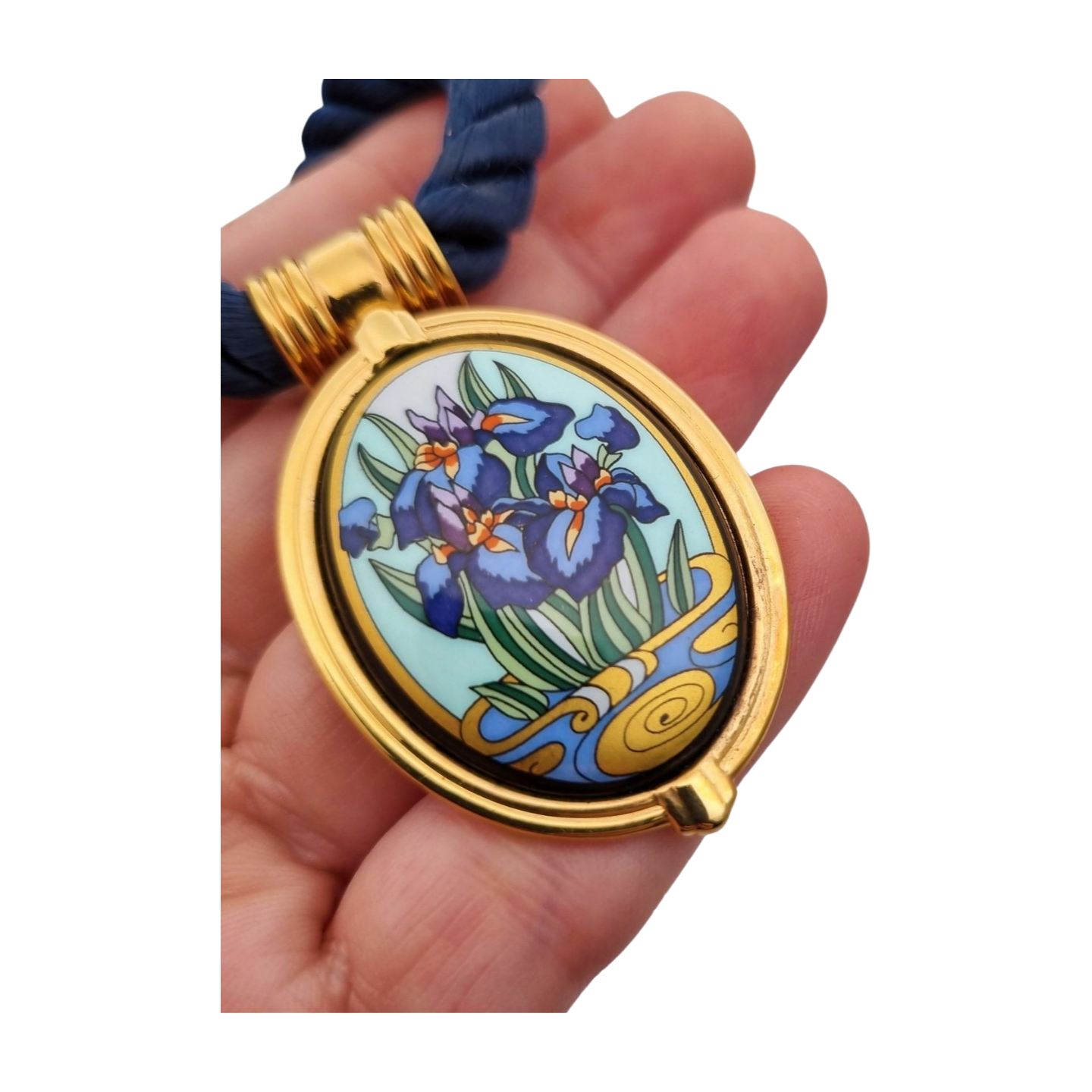 Collar esmaltado de iris Michaela Frey Wien circa 1980-90 con cordón azul. Colgante oval chapado en oro con esmalte floral.