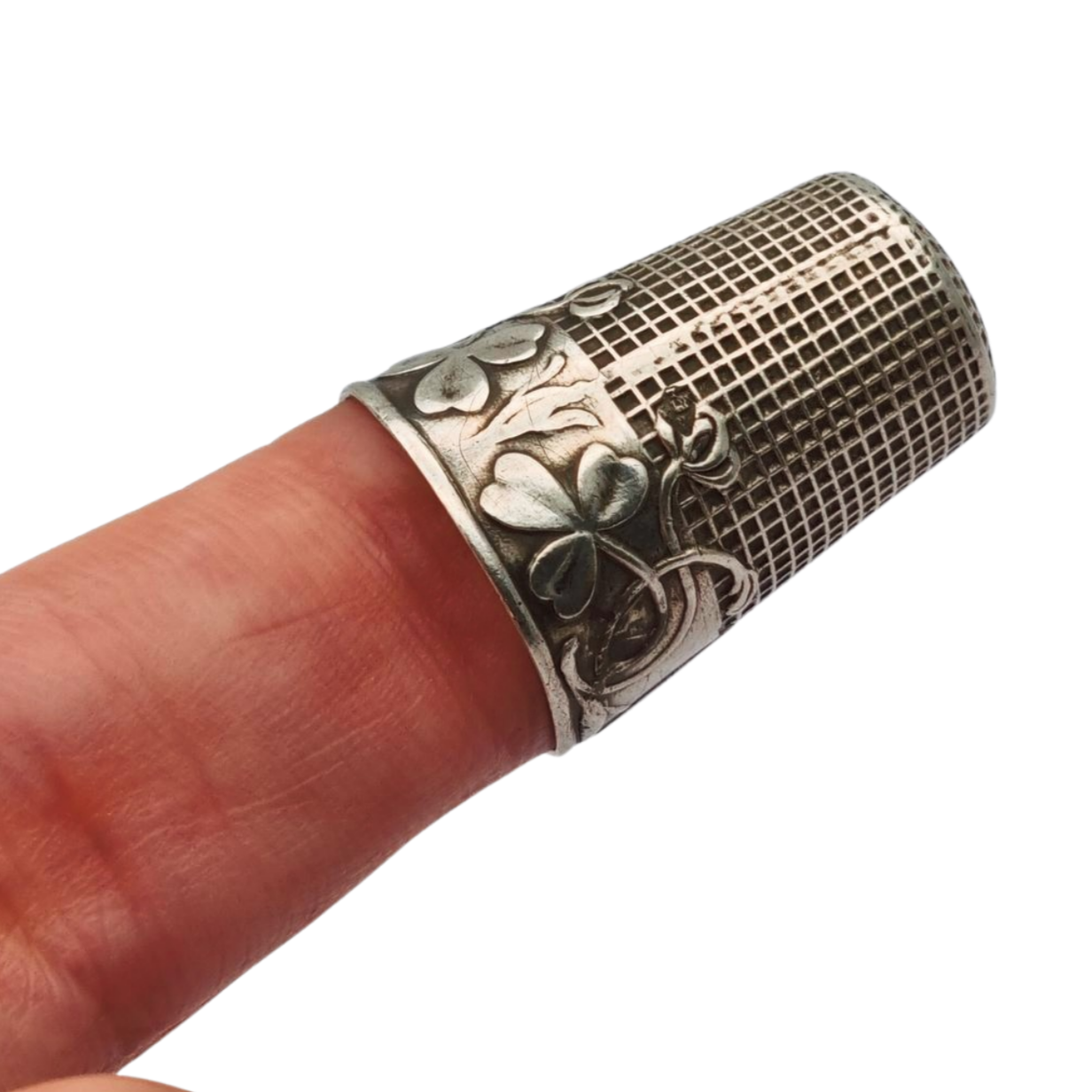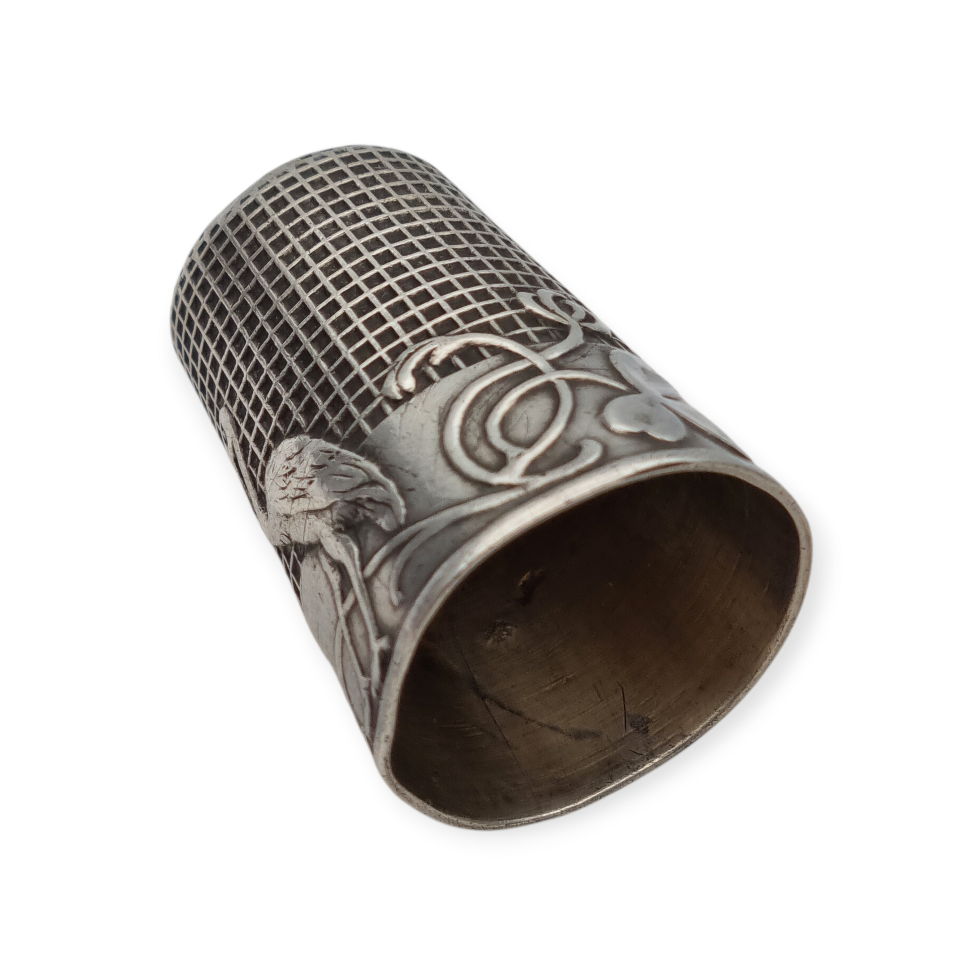 El dedal presenta relieve figurativo con los personajes de la fábula rodeando el cuerpo: el zorro y la cigüeña entre motivos vegetales. La parte superior muestra una superficie texturizada de cuadrícula para facilitar el uso en costura. Las fábulas de La Fontaine fueron un tema decorativo popular en pequeños objetos de plata a finales del siglo XIX y comienzos del XX.