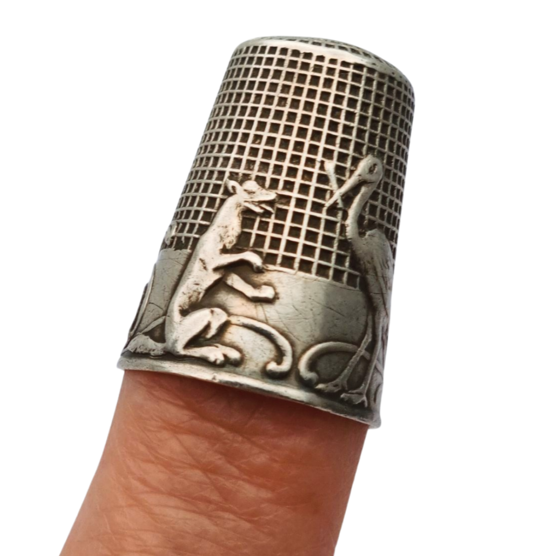 Dedal antiguo plata maciza fábula El zorro y la cigüeña La Fontaine circa 1920-30