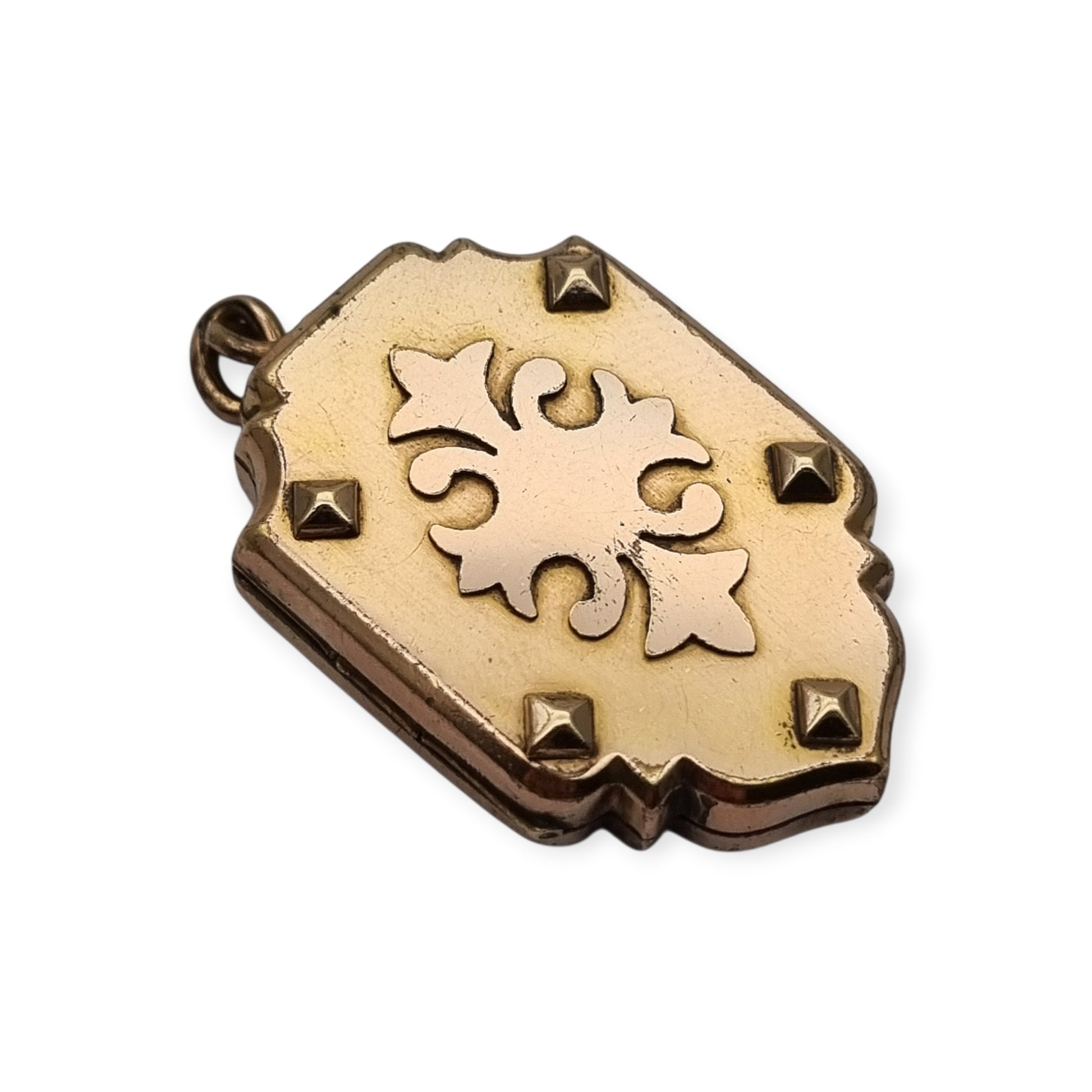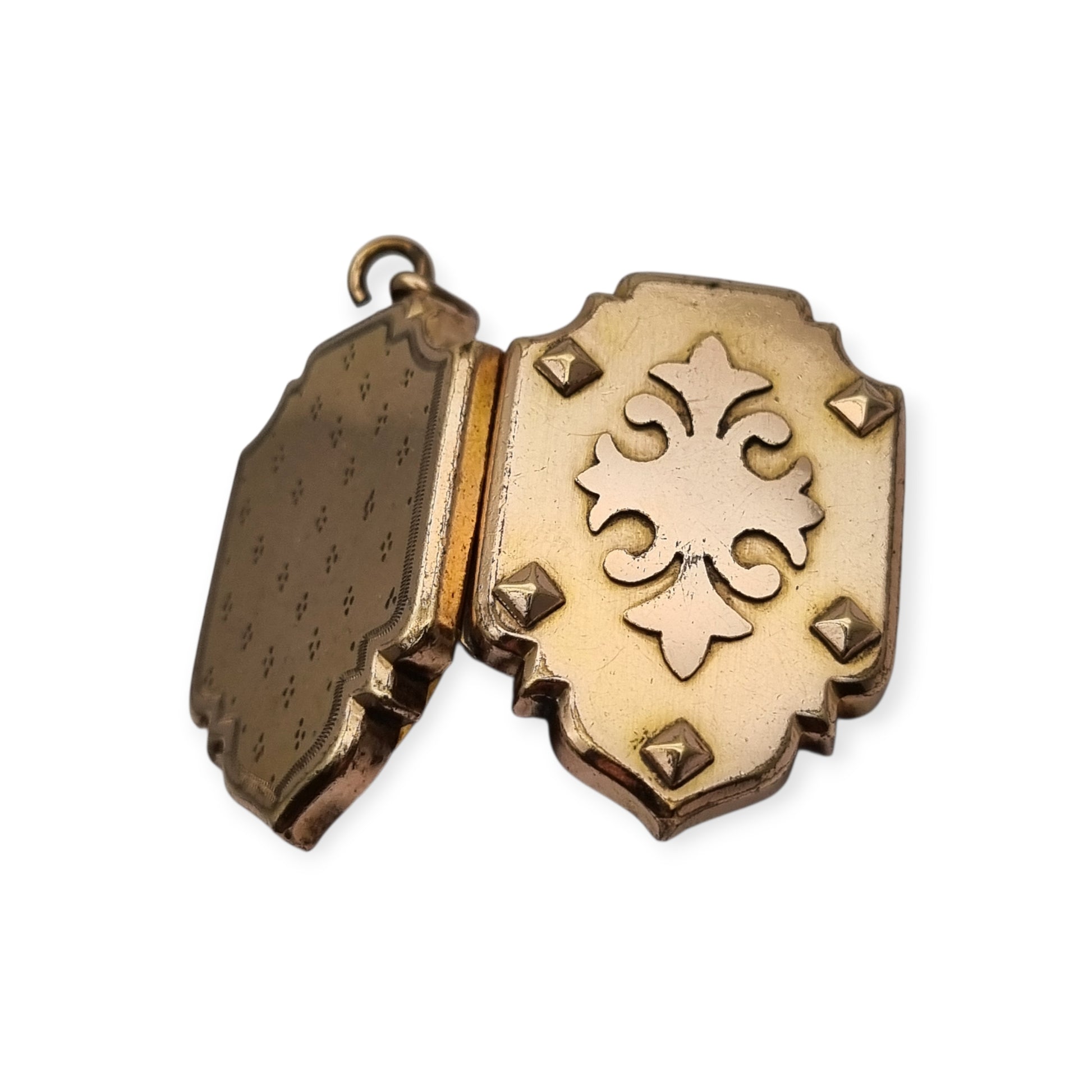 Guardapelo antiguo en metal dorado con diseño grabado y forma de escudo, época victoriana, circa 1900. Ideal como joya sentimental o pieza de colección.