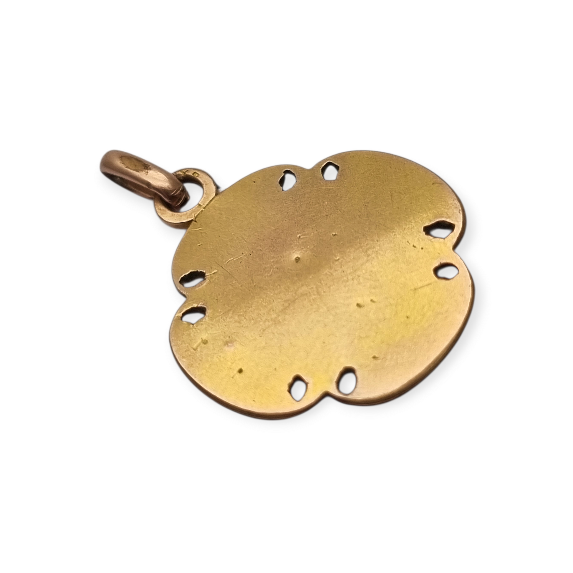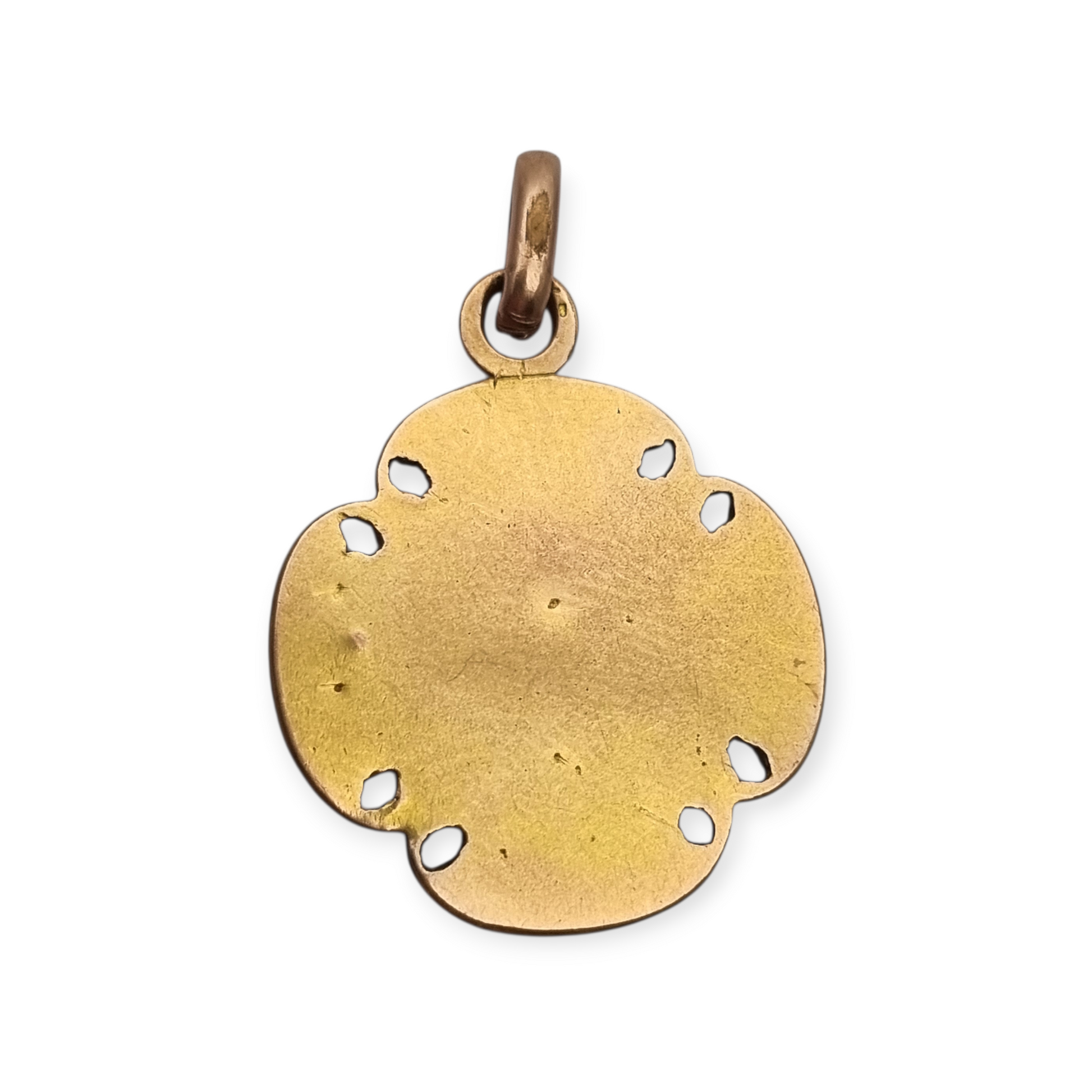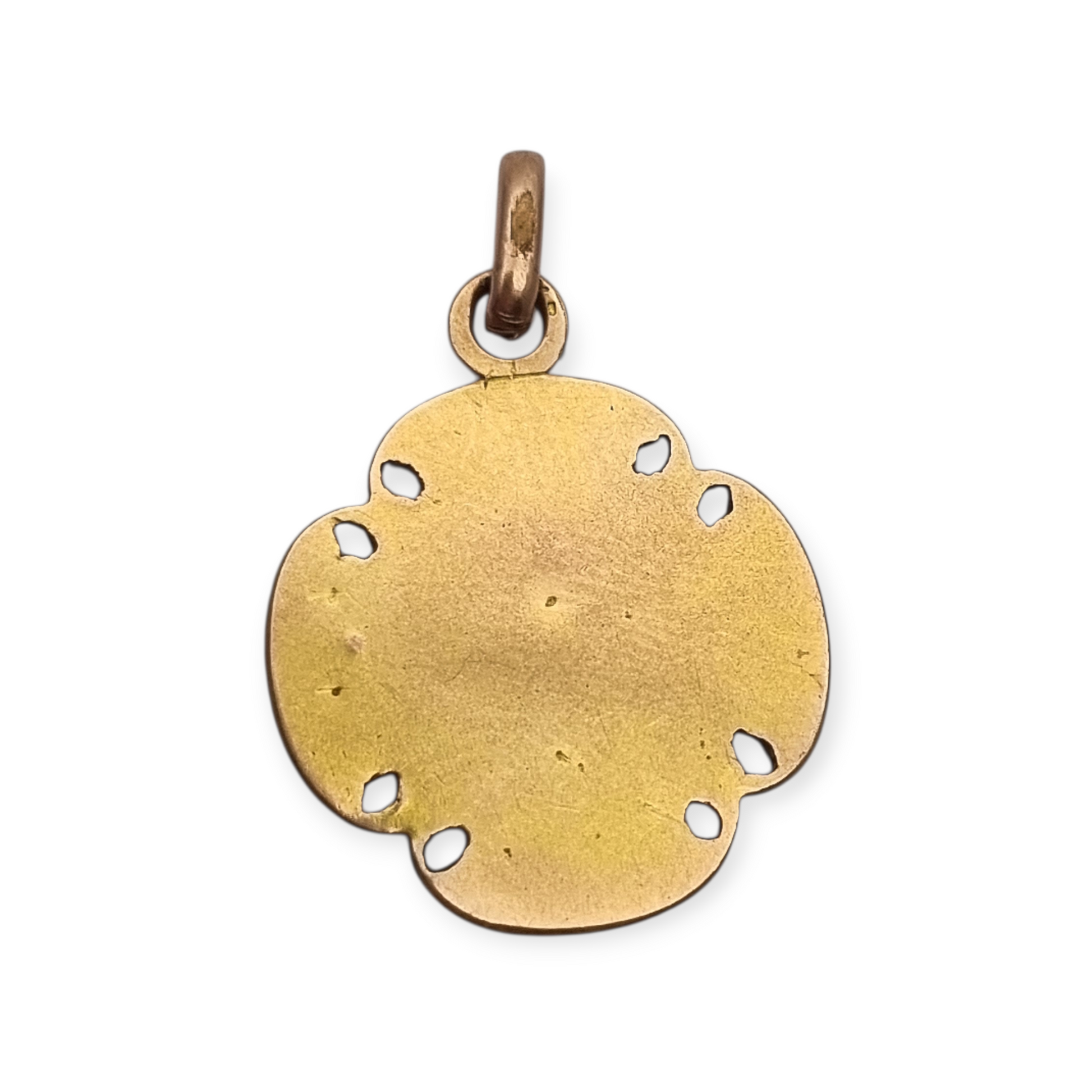 Este tipo de medallas era común como recuerdo de primera comunión o símbolo eucarístico. El cáliz con la hostia representa el sacramento y se enmarca en una cruz cuadrifoliada, símbolo de protección espiritual. Las perforaciones decorativas y los detalles en relieve recuerdan la influencia ornamental del Art Nouveau, que seguía vigente en la década de 1920 en Francia. Su forma también evoca el trébol, asociado a la Santísima Trinidad.