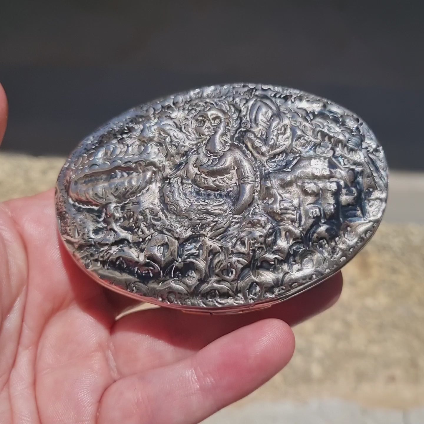 Rara caja de rapé otomana oval forjada de Meryem y naturaleza, circa 1750-1800.